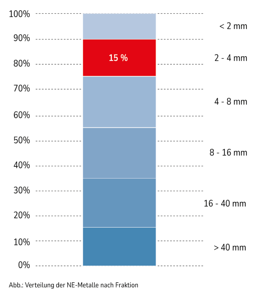 Die Verteilung der NE-Metalle in Abhängigkeit der Größe zeigt, dass ca. 25 % der Nichteisenmetalle kleiner als 4 mm sind. Dieser Anteil wird in konventionellen Aufbereitungsanlagen nicht zurückgewonnen, da die entsprechende Technik fehlt.